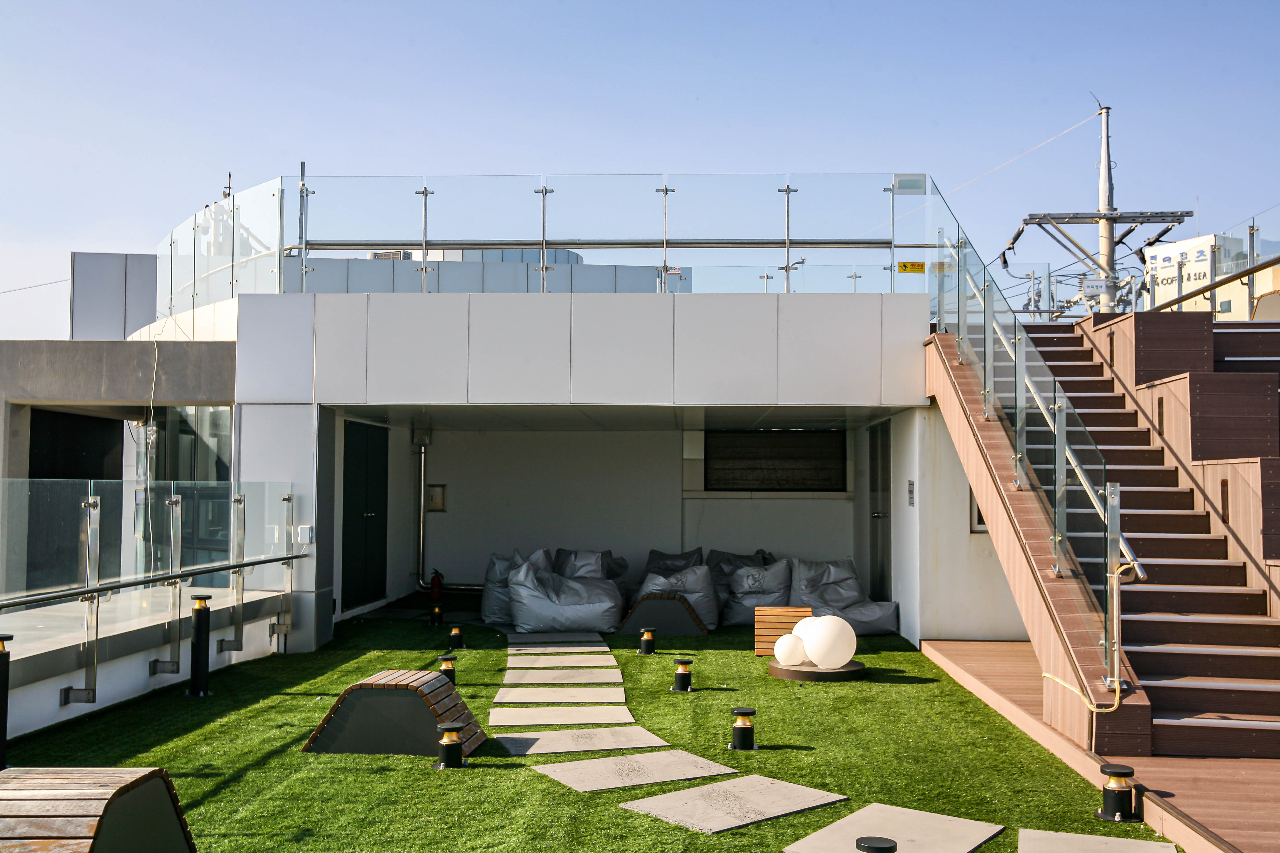 장사항 카페 테라스 인근에 유리 난간 설치가 완료되었습니다.