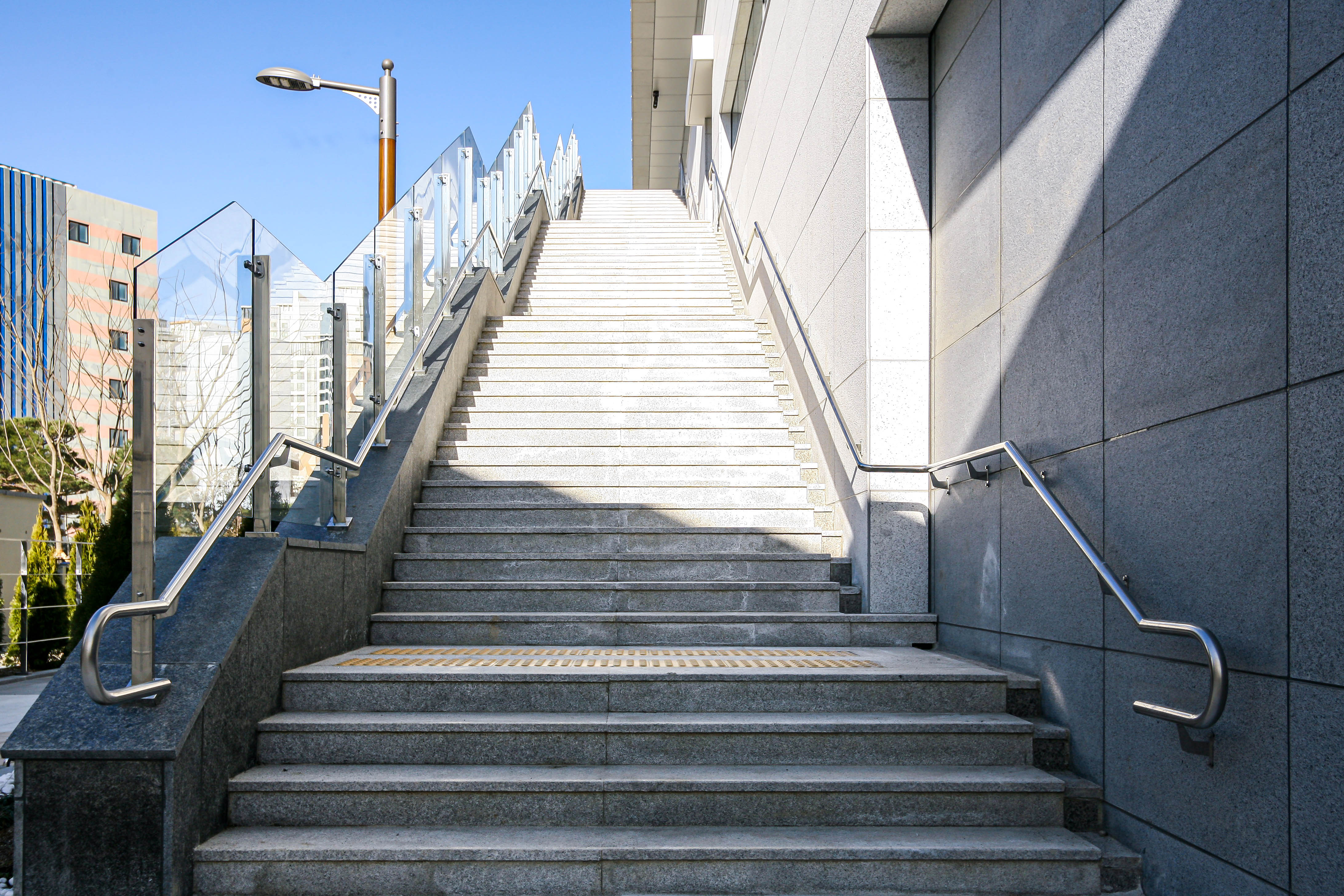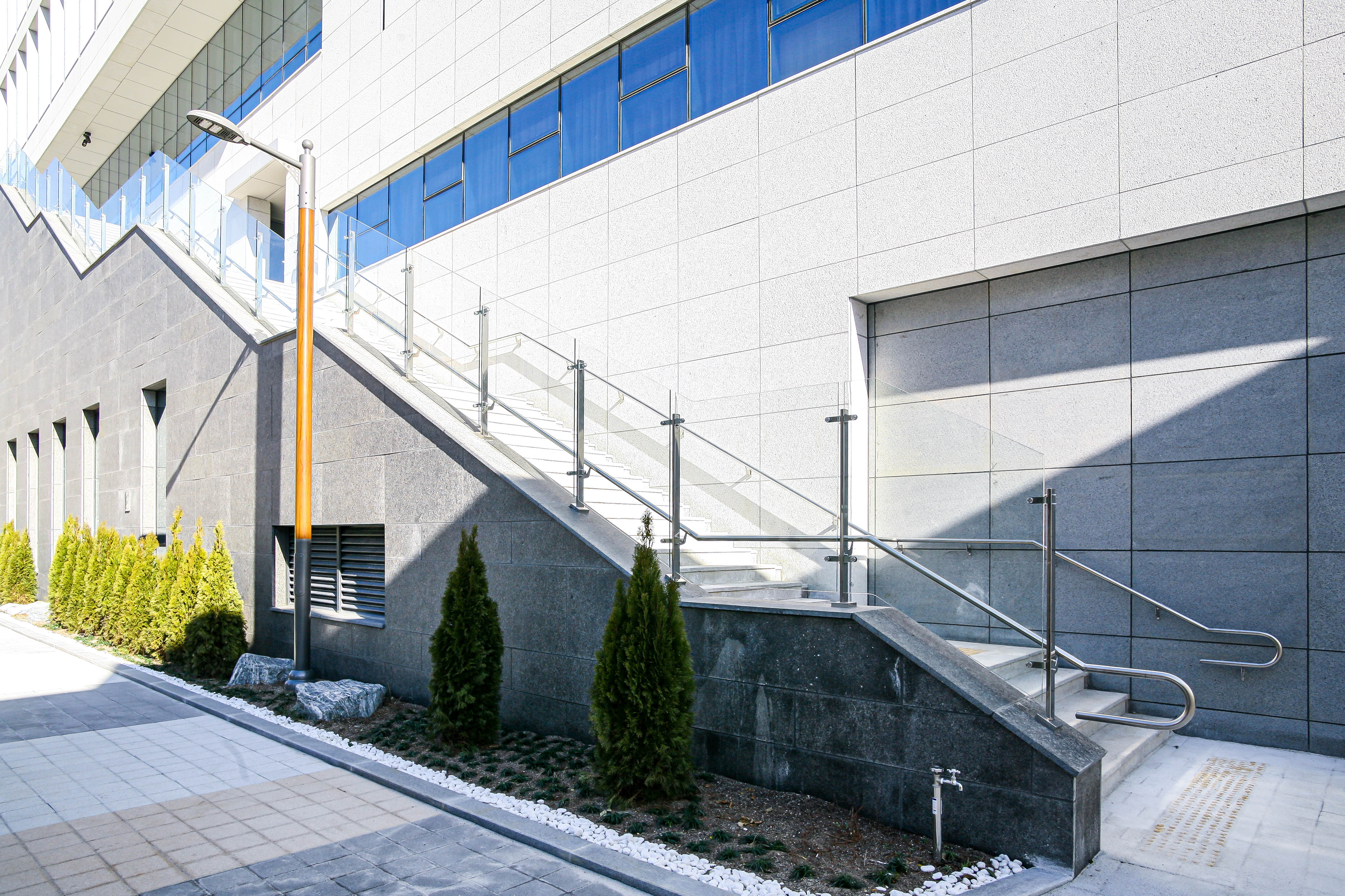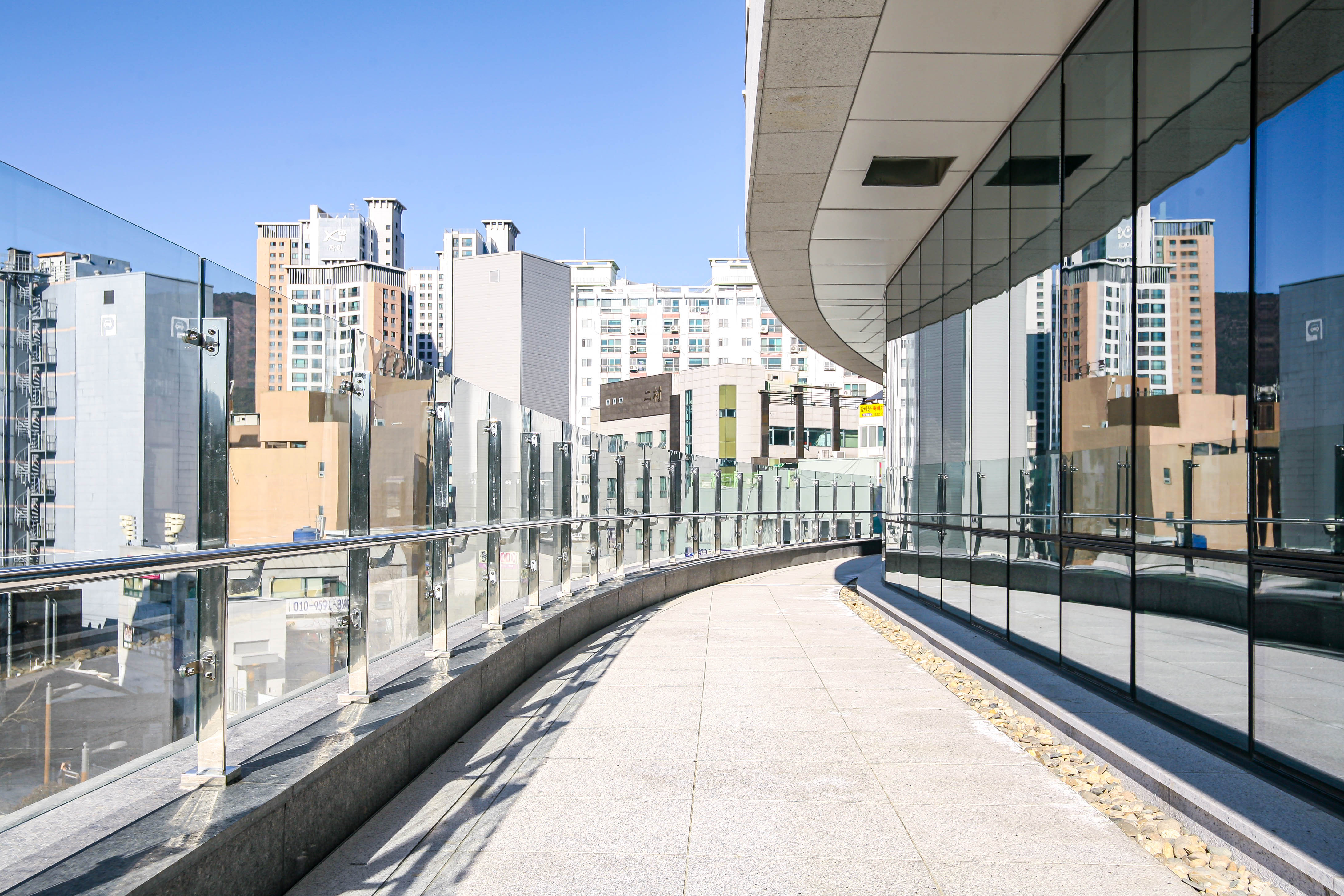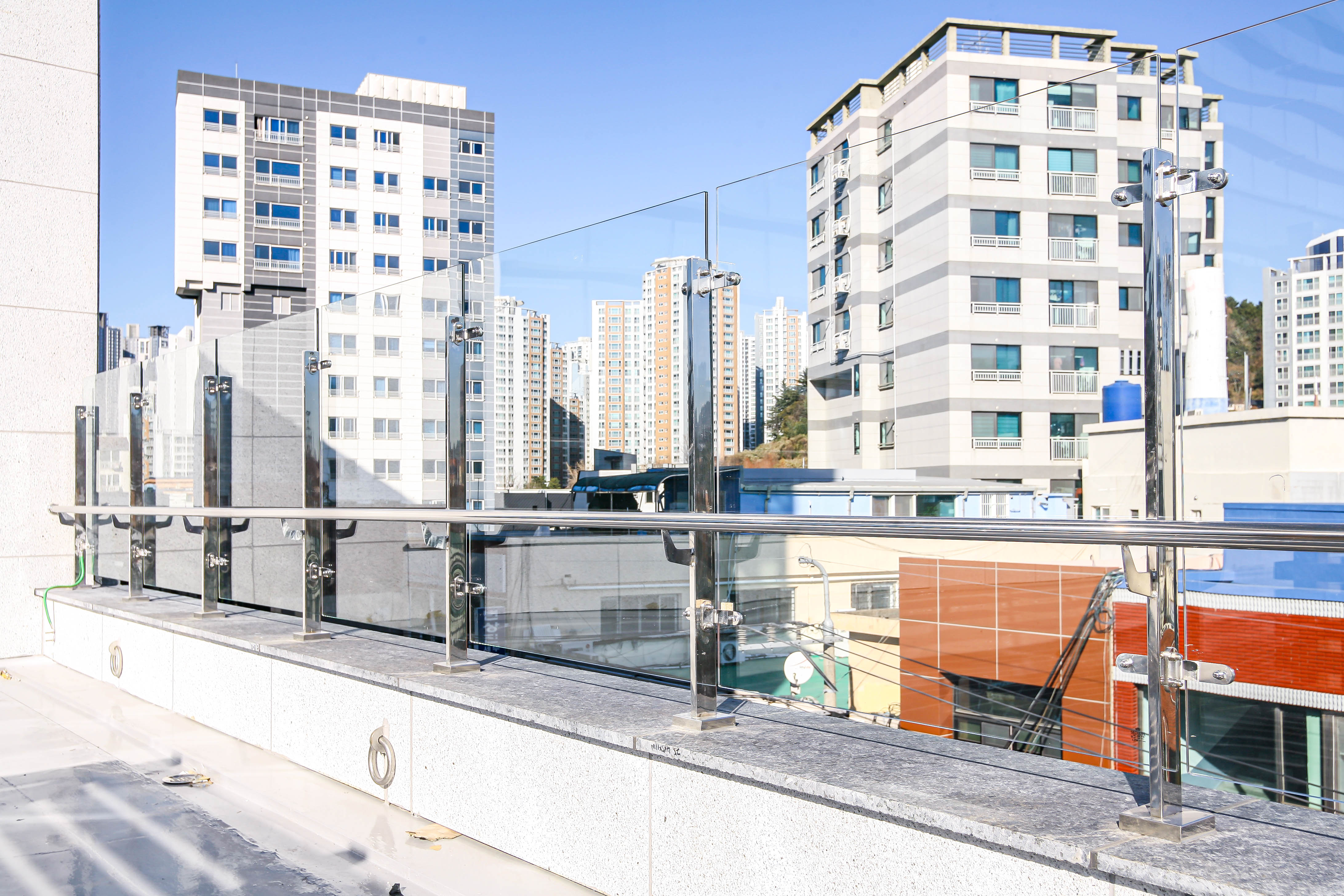 내부와 외부 전 구간에 난간몰이 강화접합유리 난간을 시공했습니다.