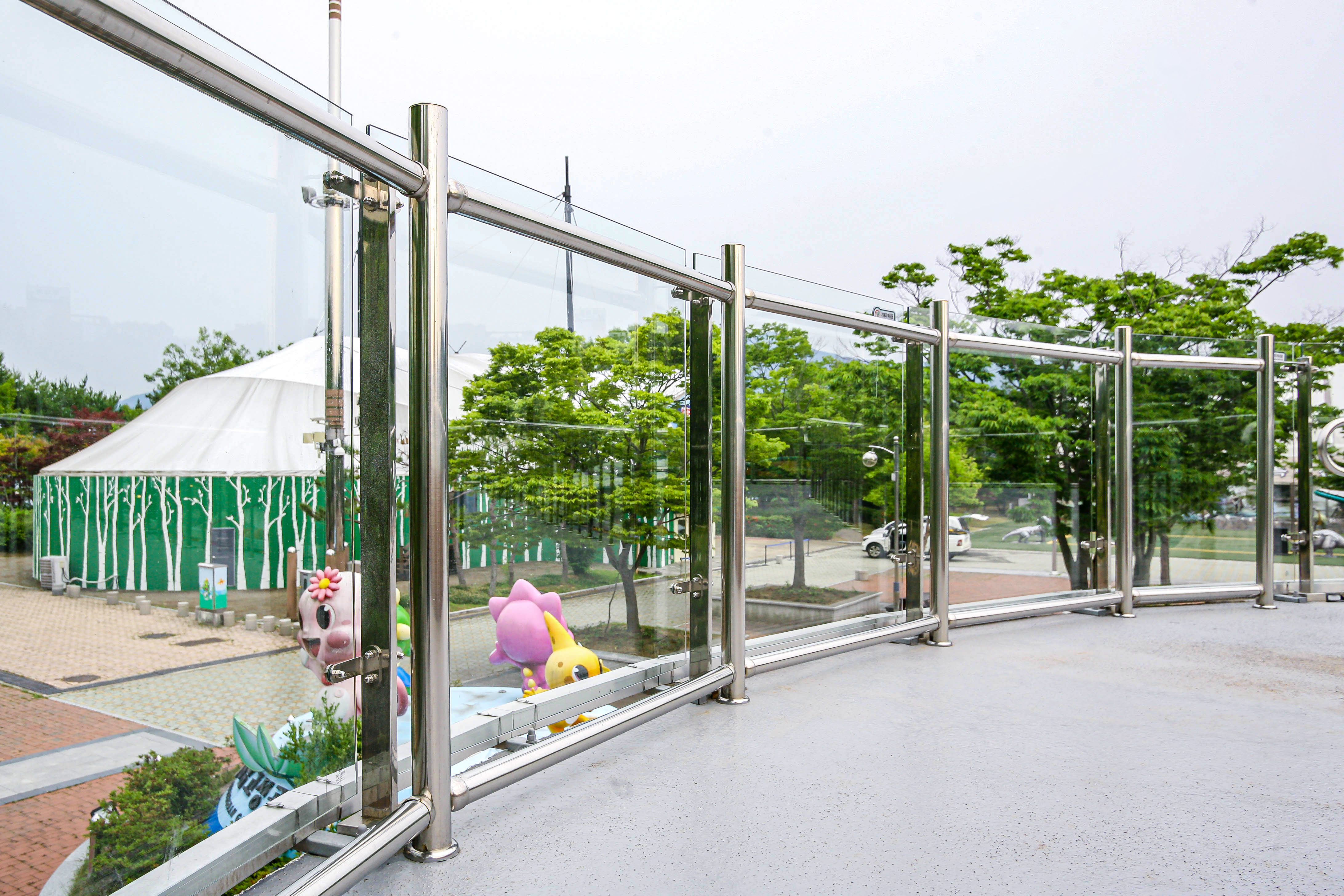 스테인리스 기둥 사이사이로 고정된 투명 유리 난간은 공간을 단절시키기보다