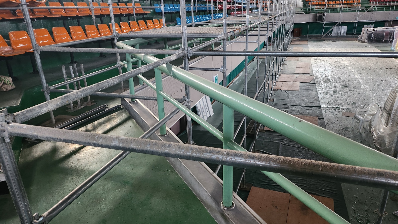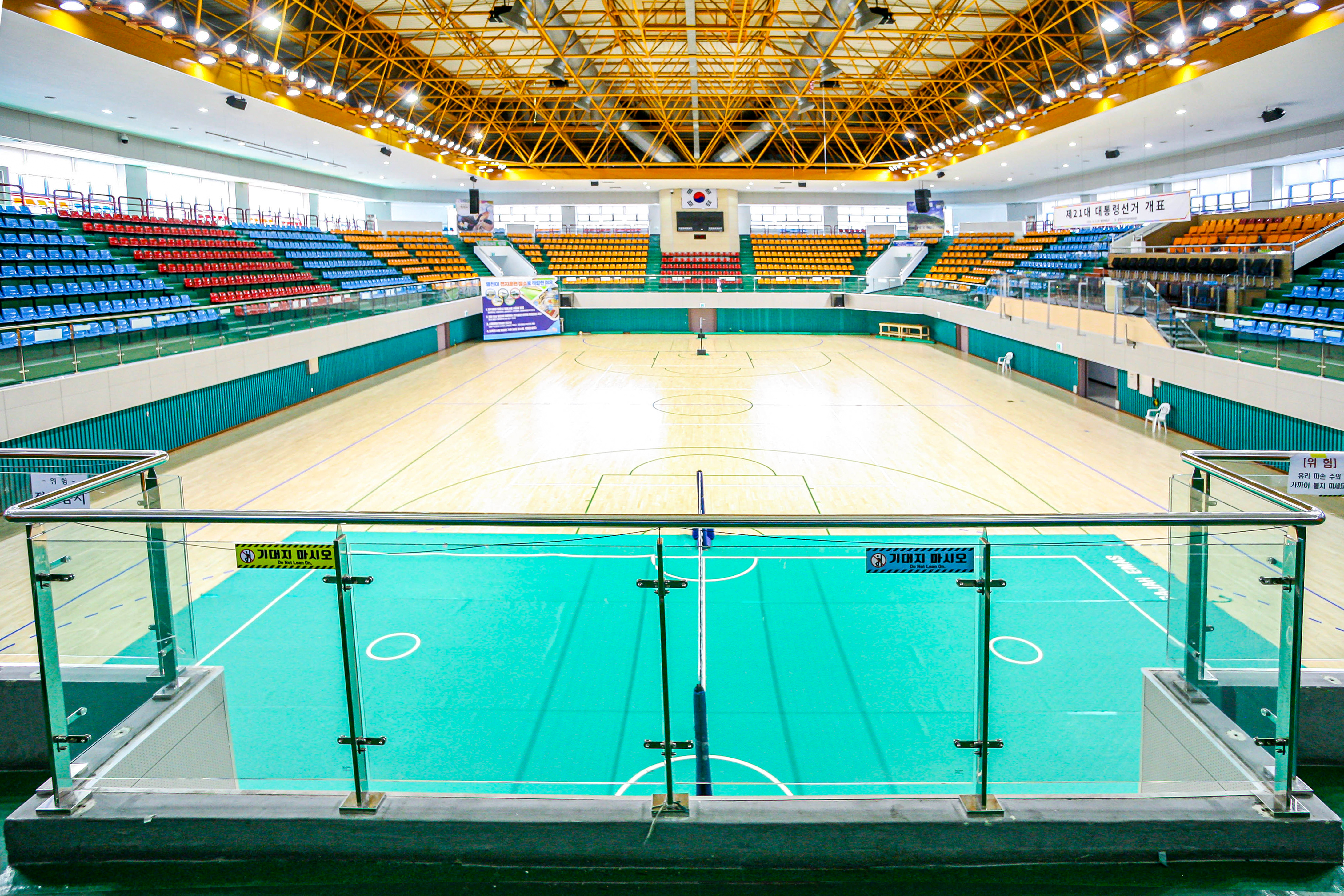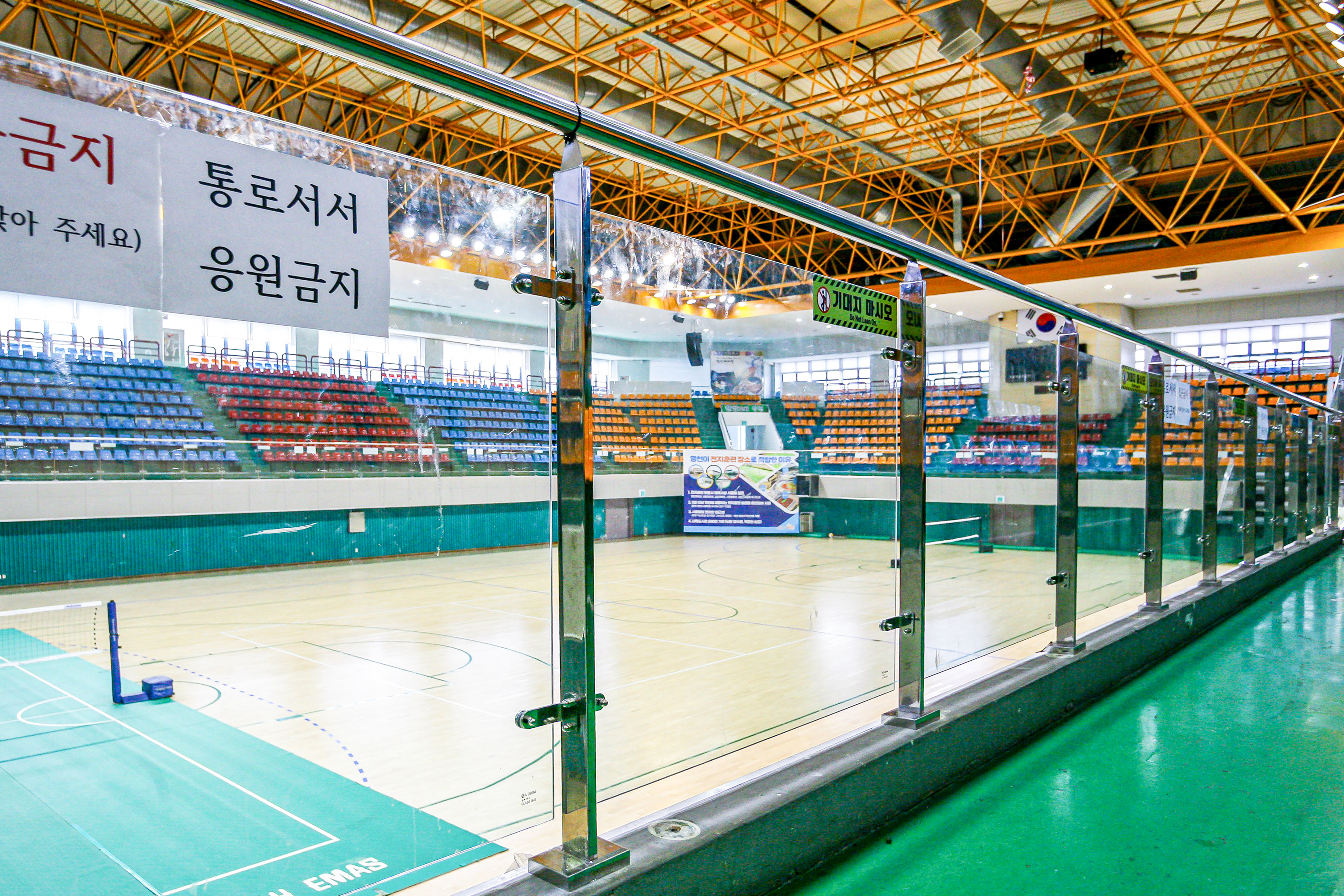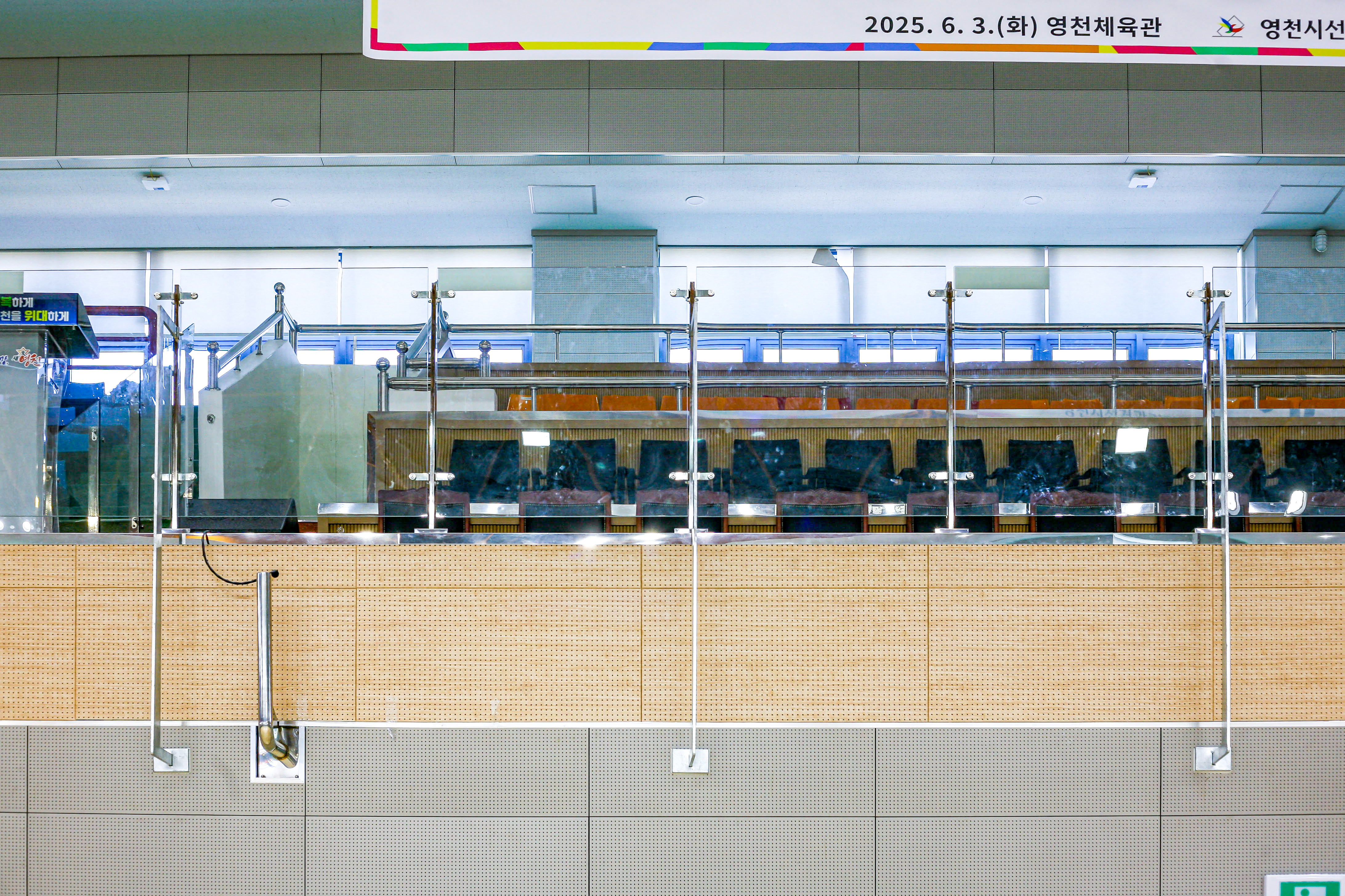 유리 고정과 마감 처리까지 모든 공정을 마친 영천체육관의 관람석은