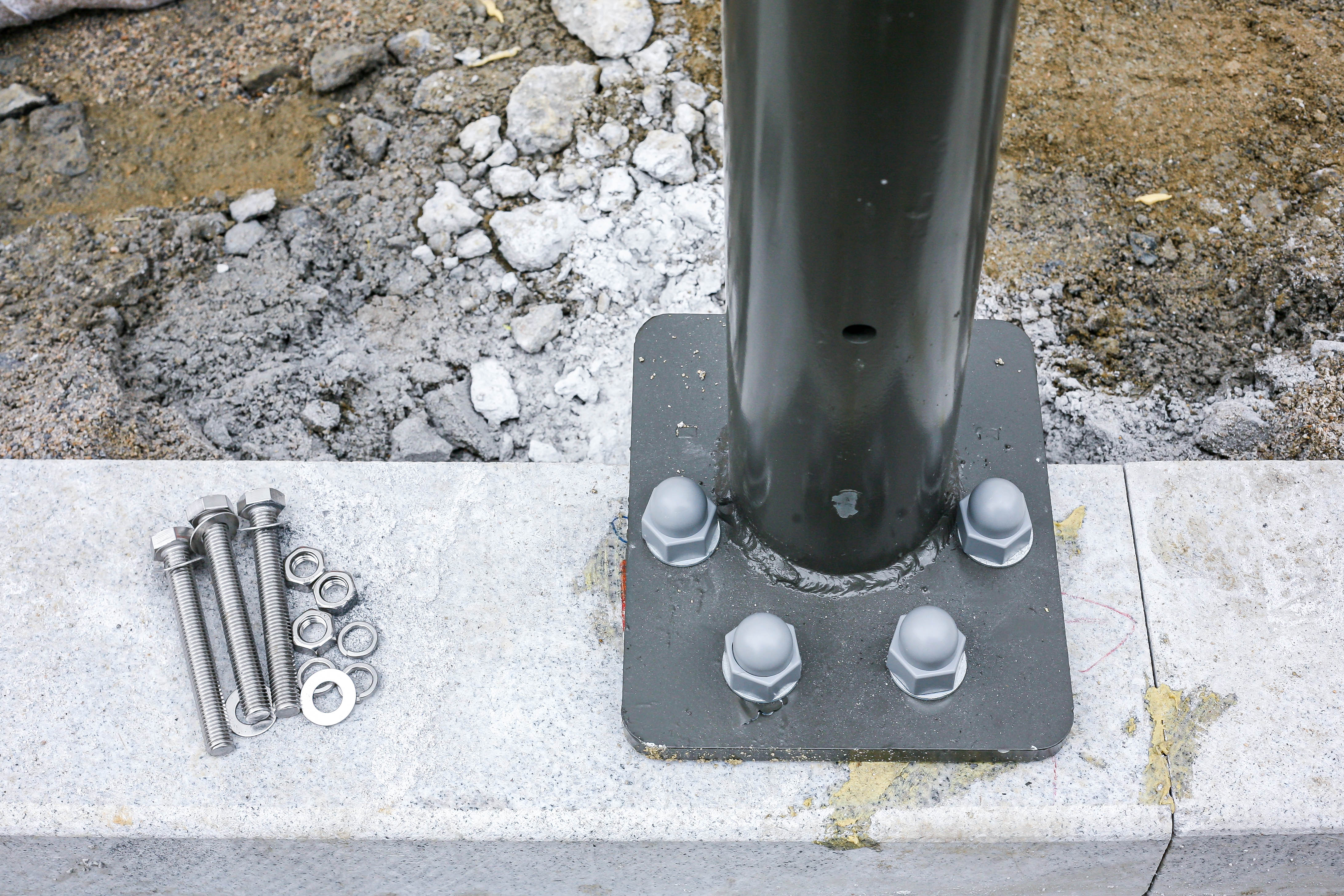 이후 돌출된 앙카 볼트 여분을 절단하고 마감 고무 캡을 씌운 뒤,