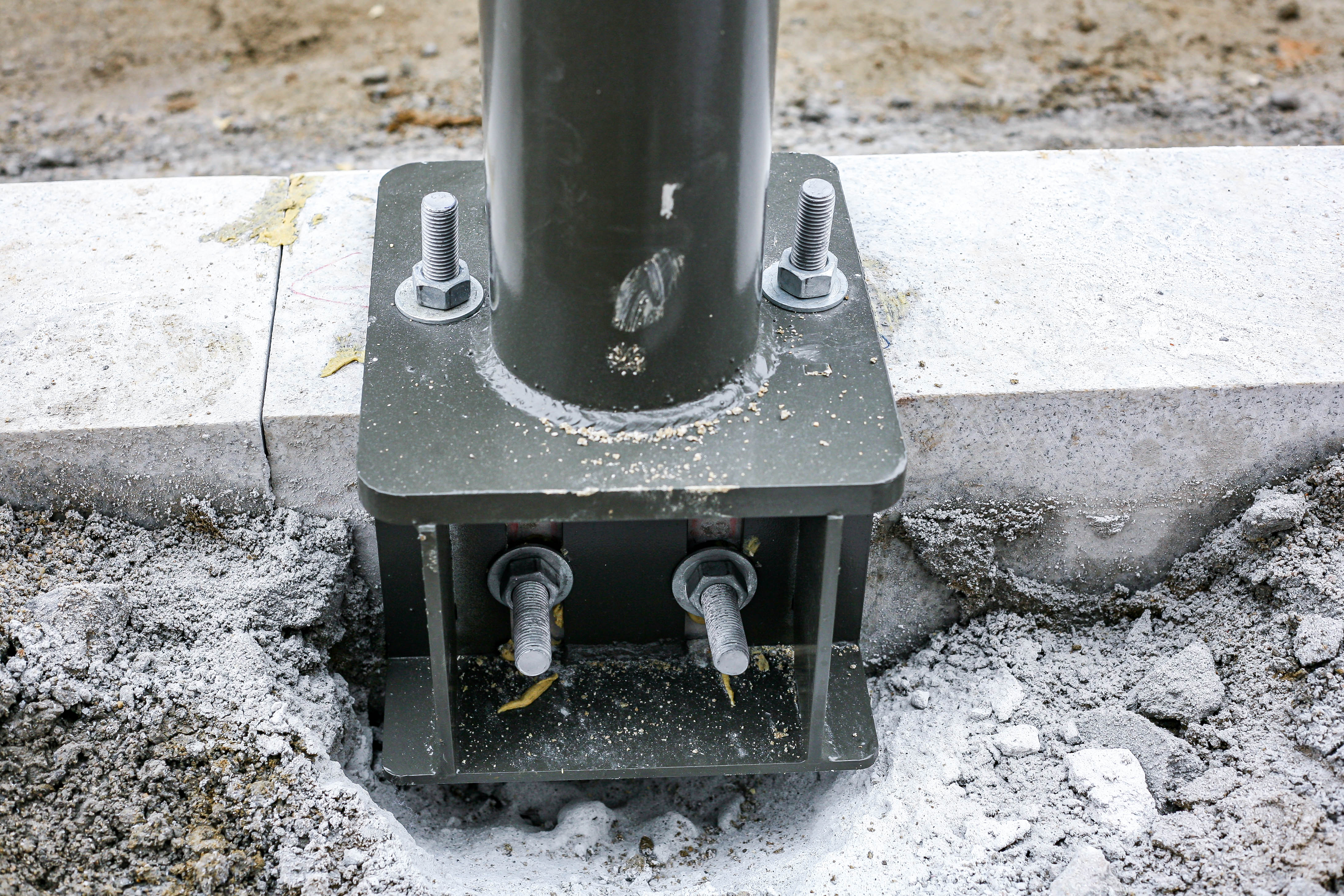 앙카 고정부가 경화되면 볼트를 균일하게 조여 수직도와 정렬 상태를 최종 점검합니다.
