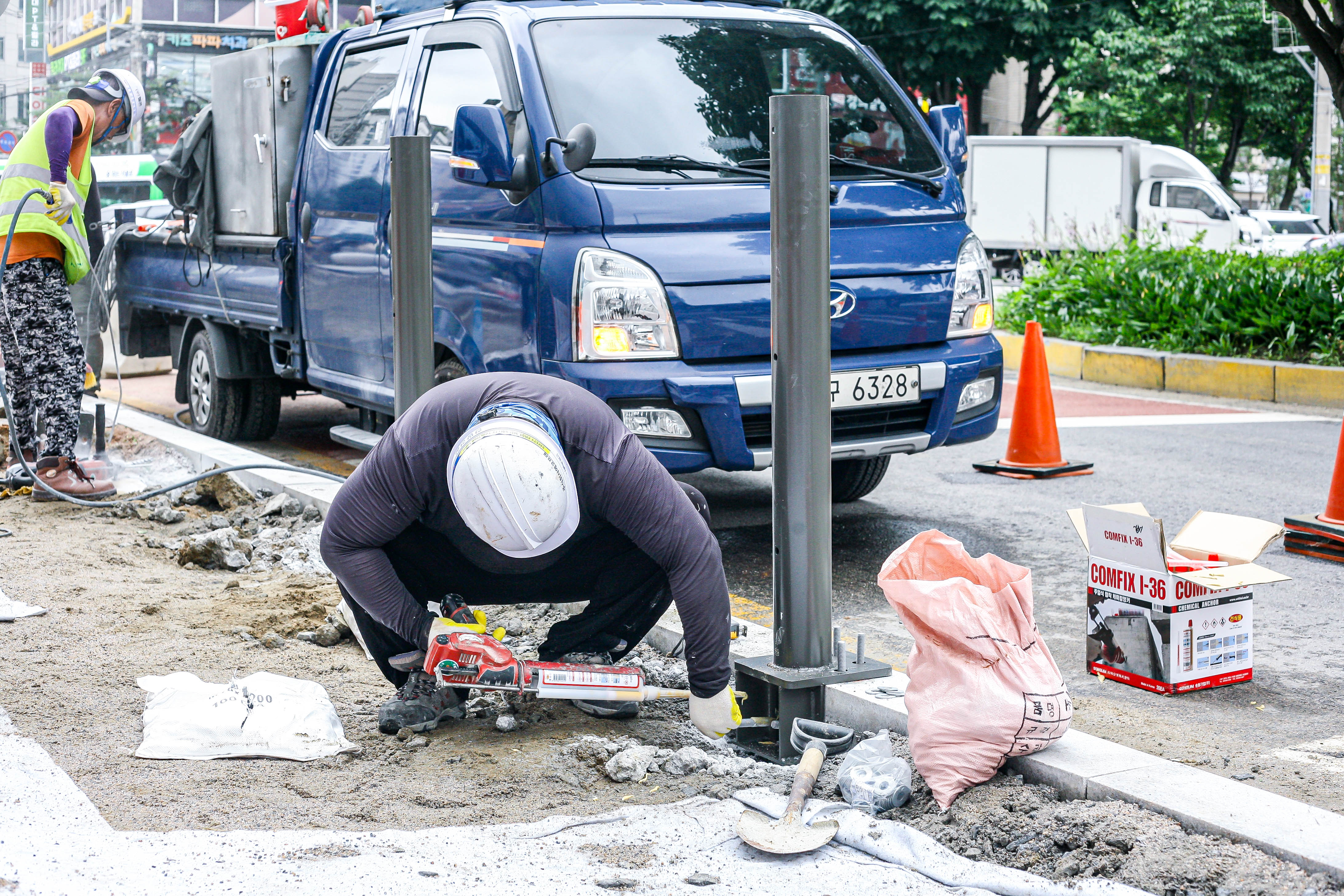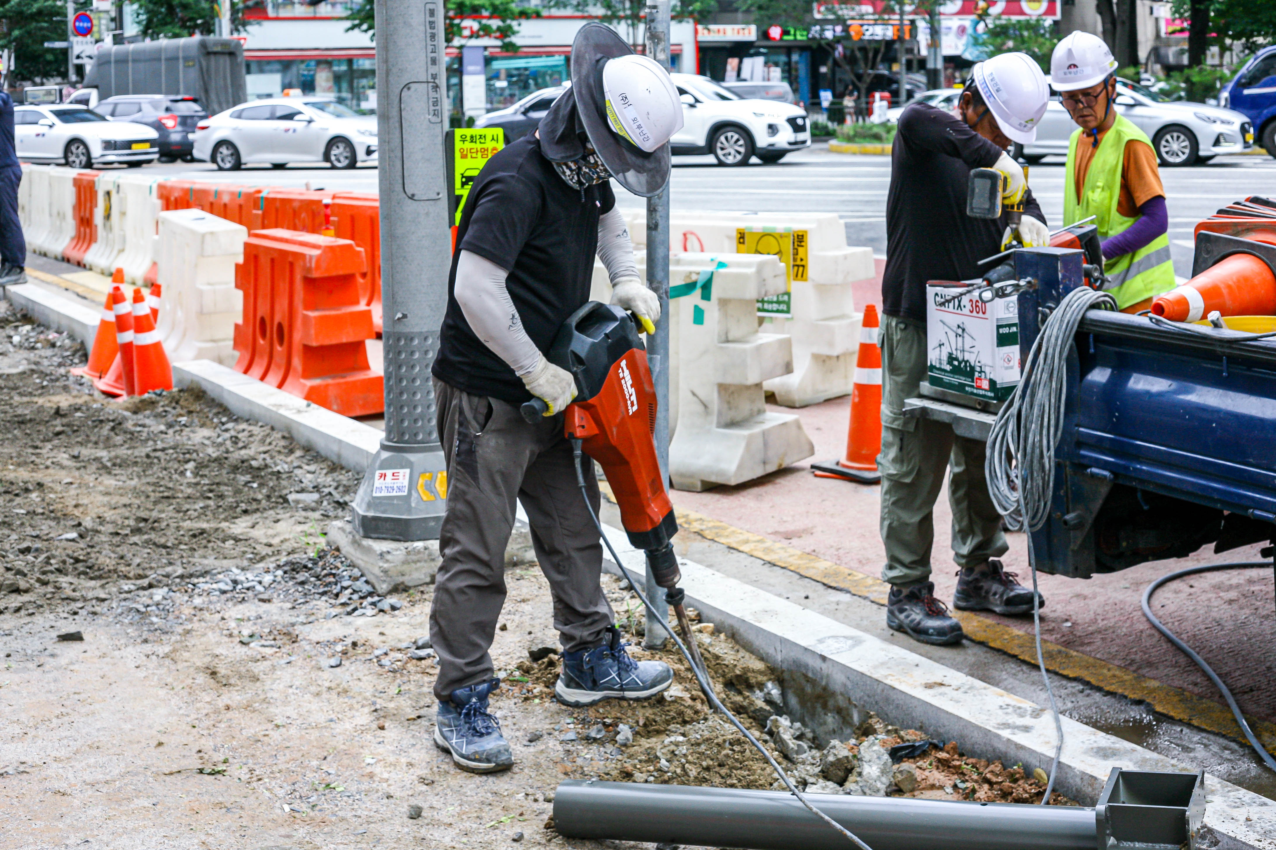 전동 드릴을 이용해 연석을 천공합니다.