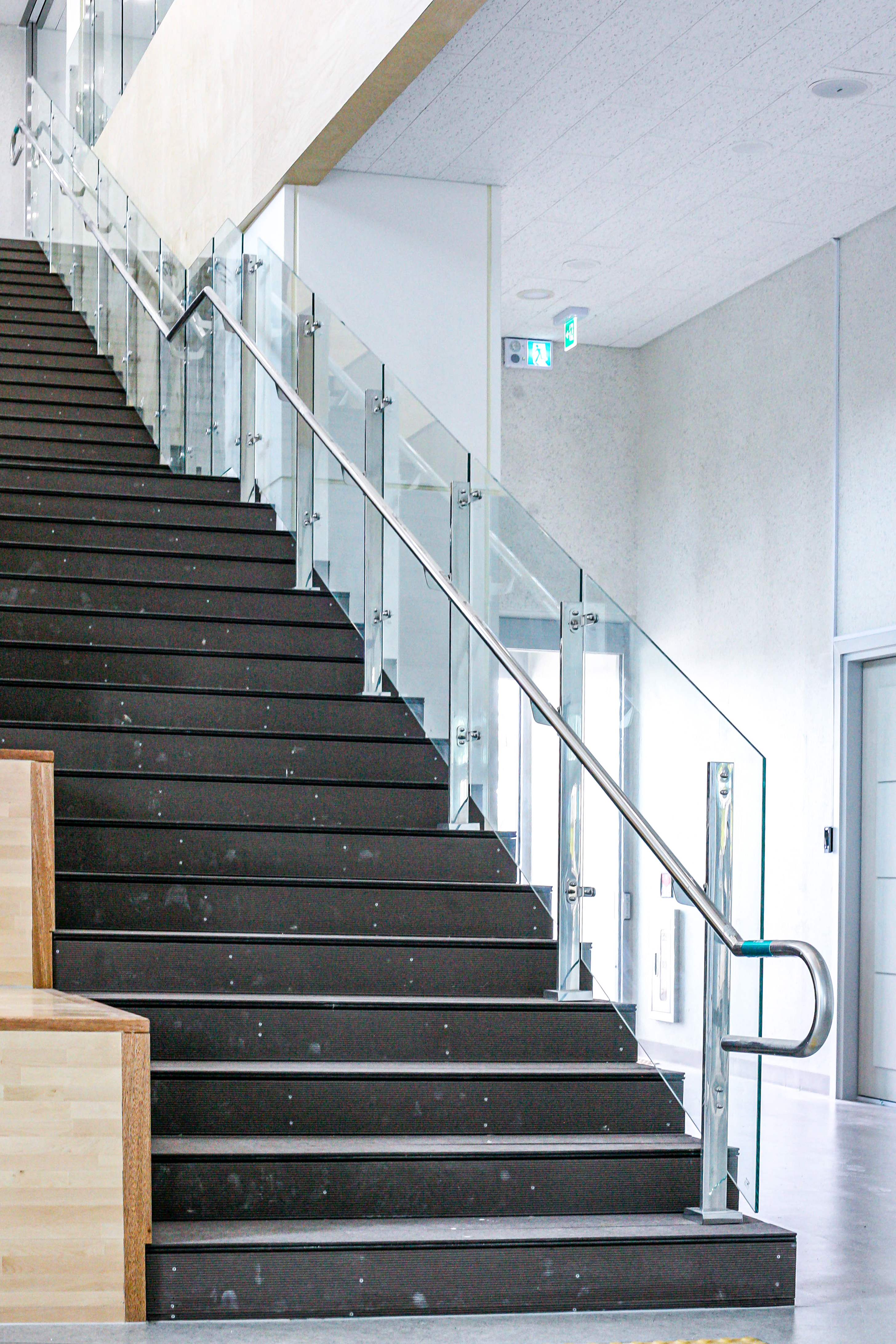 센터의 주요 동선인 1층과 2층을 연결하는 계단실에는 강화유리 난간이 적용되었습니다.