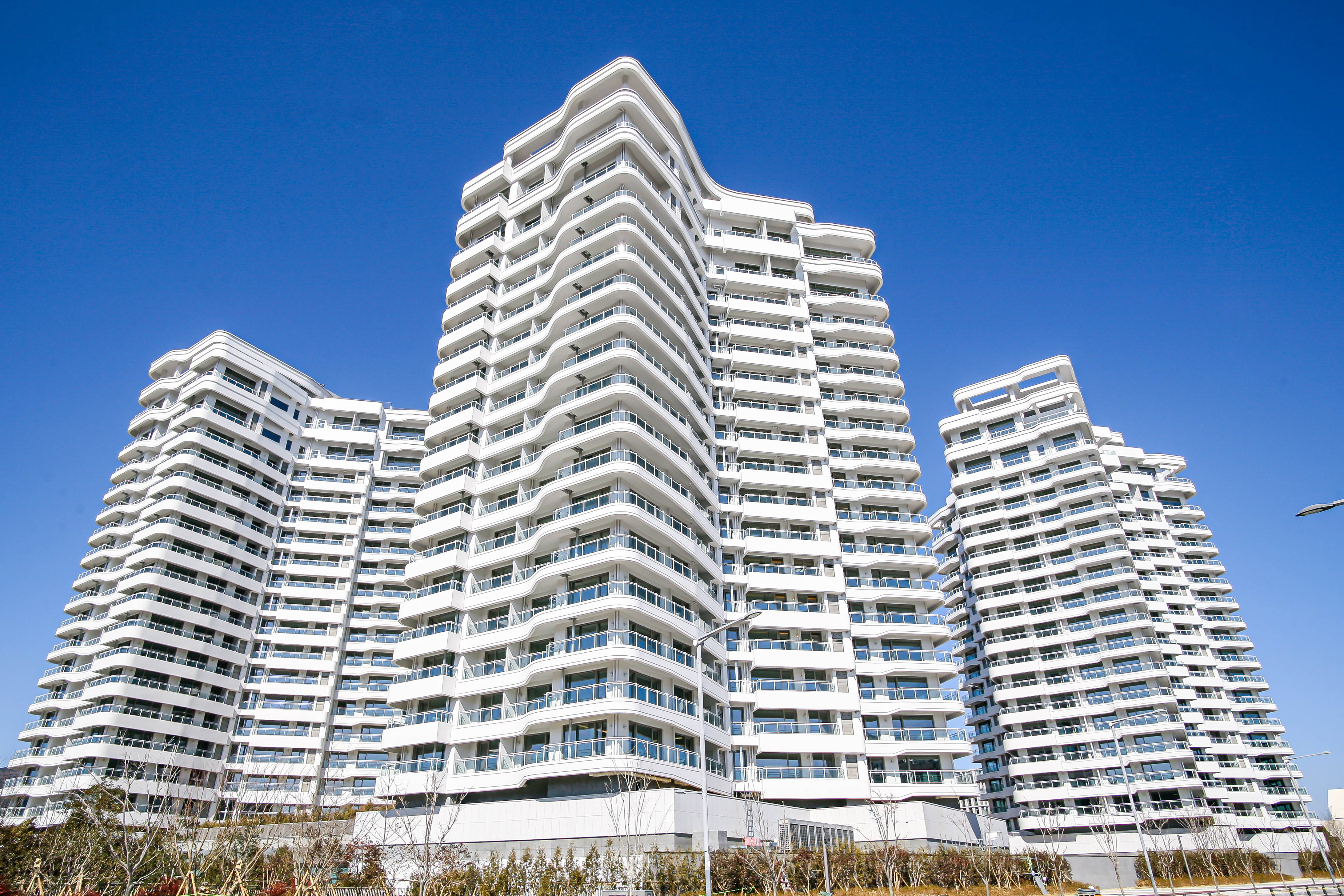 외부에서 바라보는 오시리아 메디타운은 현대 건축의 아름다움과 기능성을 동시에 보여줍니다.